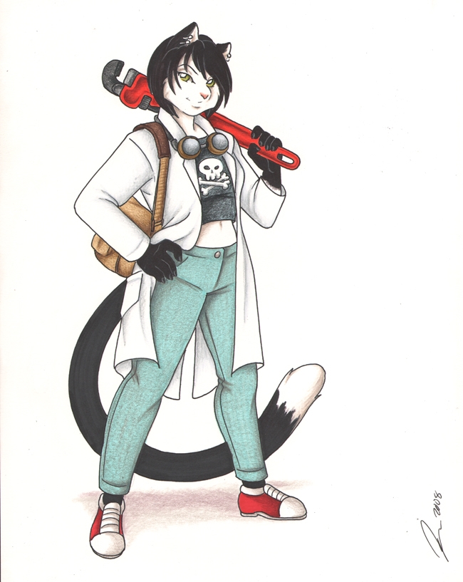 A catgirl, with a slim, dancer's physique, about 5'4" tall, in her late teens or very early twenties. Her eyes are large and expressive, a vivid yellow-green. Her hair is short straight and black, cut into a 'pageboy' style, and looking a touch windblown. Her ears, black on the outside and white fur within, stick up through it, each pierced with a couple of small silver safety pins. Her fur is white on her face and upper body, black on her hands and legs. Her tail is black with a white tip. She is wearing hip-hugging faded jeans, red sneakers, and a black babydoll t-shirt with a cartoonish skull-and-crossbones on the front. Over all this is a labcoat, with a patch on the left chest of the SMT Labs Interns' emblem. Over her shoulder, she has what looks like a Russian army surplus paratrooper bag, decorated with buttons. A pair of dark goggles hang around her neck. (These are her working clothes, she has a variety of other outfits to suit the occasion.) |