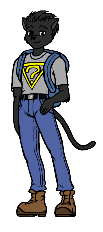 You see a male panther, about 5'6". He's slimly built, but not scrawny. He's wearing blue-jeans, a black T-shirt, heavy-looking work boots and a large, stuffed-to-the-brim backpack. The pack has 'U of SMT' written on it, and a red leaf sewn below the lettering. Rather ordinary... but something seems odd when you look at him through the corner of your eyes. |